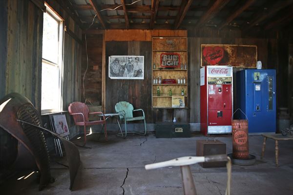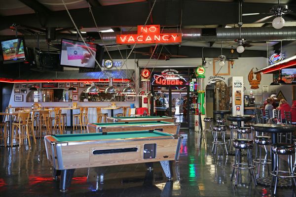 パインブリーズモーテルのオリジナルの「NO VACANCY 空室なし」の看板は、バー&グリルのビリヤード台の上にぶら下がって誇らしげに表示されています。