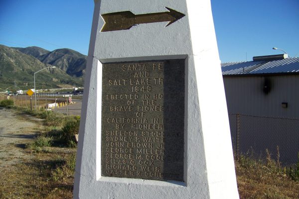 白い石積みの記念碑には、「1849年にSheldon Stoddard Sydney P. Waite John Brown Jr George Millerによってサンタフェとソルトレイクトレイルを旅したカリフォルニアの勇敢な開拓者に敬意を表して1917年に建てられました。