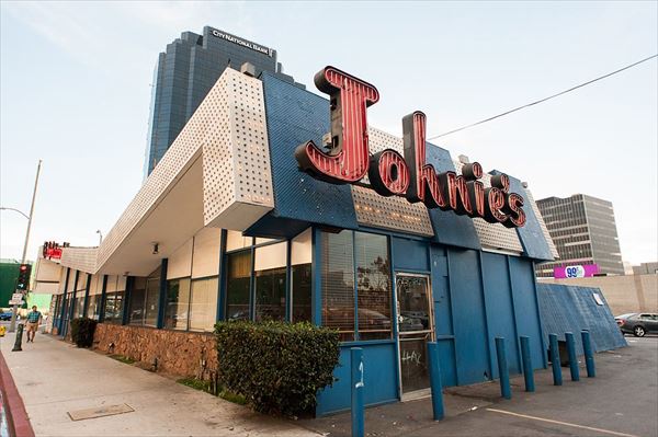 ウィルシャーブールバードとフェアファックスアベニューの角にあるメイカンパニービルの向かいには、1950年代と60年代に人気のあったグーギー建築様式のロサンゼルスで最も優れた例の1つであるジョニーズコーヒーショップがあります。