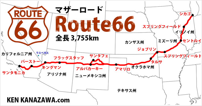 ルート66アメリカ大陸横断 ルート66は1926年11月11日創設 アメリカ初大陸横断道路で 全長は3755kmの距離がある。
