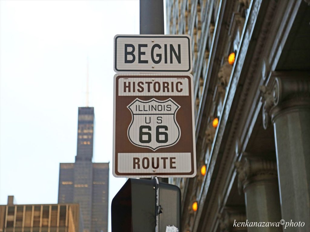 ルート66 イリノイの距離は462km。ルート66の出発点である シカゴにBEGINの看板がある。