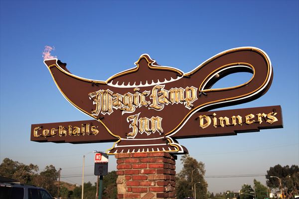 レンガの柱に取り付けられたアラジンの魔法のランプに「マジックランプイン カクテル&ディナー」の看板がある。