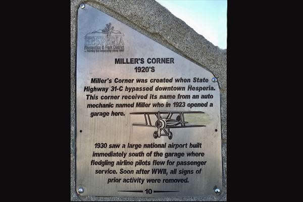 ミラーズコーナーのマーカーは、州道31-Cがヘスペリアのダウンタウンを迂回した時に作成された記念碑です。